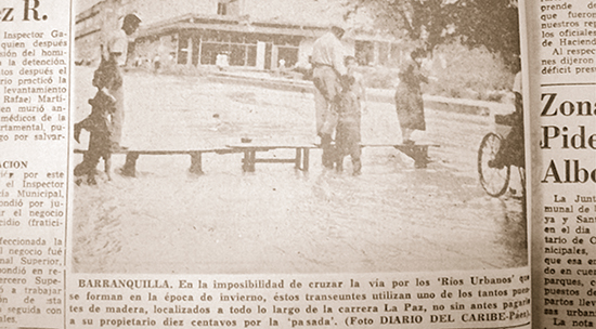 Fotografía. Puente improvisado. La gráfica muestra a varios transeúntes cruzando los "ríos urbanos" a través de improvisados puentes de madera. El servicio cuesta diez centavos.