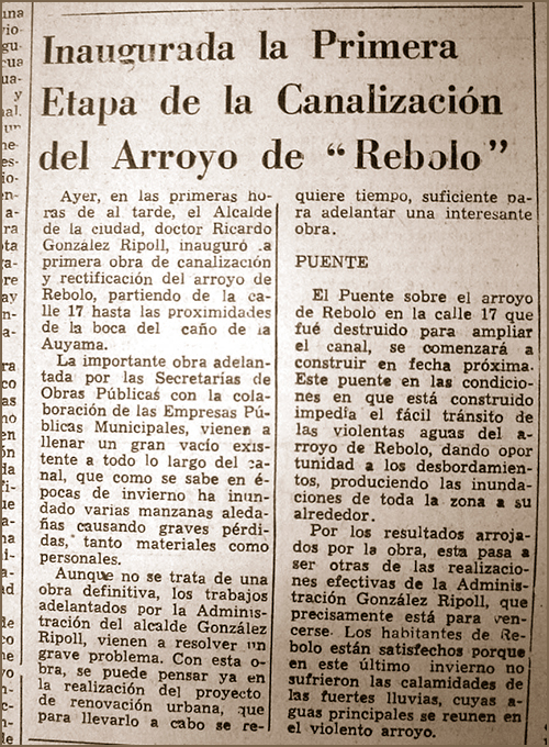 Inaugurada la primera etapa de la canalización del arroyo Rebolo. p. 3. El Acalde de la ciudad Dr. Ricardo González Ripoll inauguró la primera etapa de canalización y rectificación del arroyo Rebolo, partiendo de la calle 17 hasta las proximidades de la boca del caño de la Auyama. Próximamente se repara el puente de la calle 17.