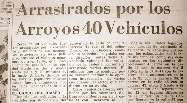 Cerca de cuarenta vehículos fueron arrastrados en el aguacero de ayer tarde. Uno de los carros más afectados por el arroyo de la calle 52 con carrera 41 fue el del señor Obispo de la Diócesis. El vehículo del obispo conducido por un sacerdote fue volcado por la violenta corriente y arrastrado varios metros. El sacerdote que lo conducía pudo salvarse gracias a la intervención de varios ciudadanos del sector que acudieron en su ayuda. El cuerpo de Bomberos auxilió a otros vehículos en diferentes sectores de la ciudad.