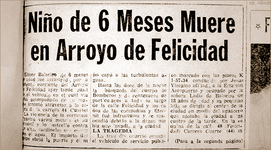 Elmer Balseiro de seis meses fue arrastrado por la corriente del arroyo Felicidad ayer tarde, cuando el vehículo acompañado de su madre, intento atravesar el arroyo de la carrera 44. La violencia de la corriente arrastró varios metros el auto y lo estrelló contra los altos sardineles. El impacto del golpe abrió la puerta y el niño cayó a las turbulentas aguas. Su cadáver nunca fue encontrado.