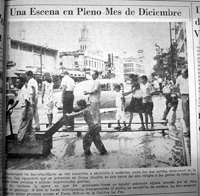 Fotografía que muestran como varias personas cruzan por un puente improvisado, el Paseo Bolívar con la Carrera La Paz. Una escena poco común en el mes de diciembre.